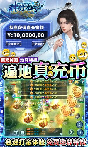 2.创角即送满级VIP,88W8888元宝,3千万银两、千元真充红包和称号-大富翁赚真充。什么?福利不够?我还要更多?别急,地尊特权免费送,首充也不用花一分钱。首日0元购,次日登录直送天级宠物-玄天,登录八天直接进化皇宠-黄金玄者。还有更多其他福利!