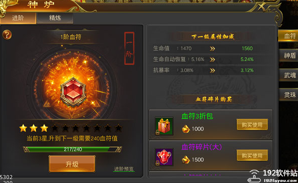 神炉系统分血符,神盾,武魂,灵珠4种装备,分别对应属性生命、防御、攻击、暴击.不同的装备升级所需的资源不同,当资源达到一定值时点击按钮即可升级,升级可增加一定的属性。每个装备每阶分为10星,升满10星后再次升级可升阶,升阶可改变装备形象。神炉材料可通过材料副本、商城、活动获得。