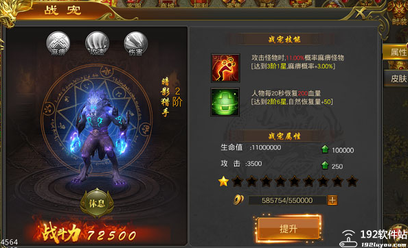 玩家15级即可开启战宠系统,系统开启后玩家可激活战宠并出战,出战的战宠会主动攻击附近的怪物。战宠升级需要消耗一定的金币,战宠等级越高属性越强。装备评分达到一定条件即可激活相应的战宠皮肤,战宠皮肤有高额的属性加成。玩家可以通过购买战宠礼包(麻痹、攻速、真伤)从而提高战宠属性。