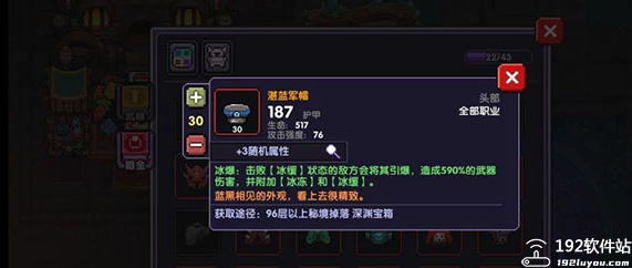 2、湛蓝军帽:这件头部装备也是96层以上秘境掉落的箱子才会开出来的,其特效是冰爆,击败冰缓状态的敌方是会将其引爆,造成590%的武器伤害,并附加冰冻和冰缓。