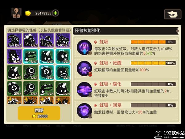 3、第一个技能强化到下一级需要5个绿色怪物,第二个技能需要5个蓝色怪物,第三个技能需要5个紫色怪物,第四个需要5个橙色怪物;