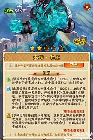 水神出战属性是为前排武将加伤,后排武将减伤,可以说是完美的出战属性,既保证了前排的输出,又减少后排抵挡的伤害。水神为防御宠物,比较适合做副将的护佑,他能更好的让副将在战斗中生存、保证与主将的合击。一个0星满神炼的水神上阵也可以,因为奶量不受战宠攻击力的影响,吞噬的技能加伤对奶量也没有什么影响。
