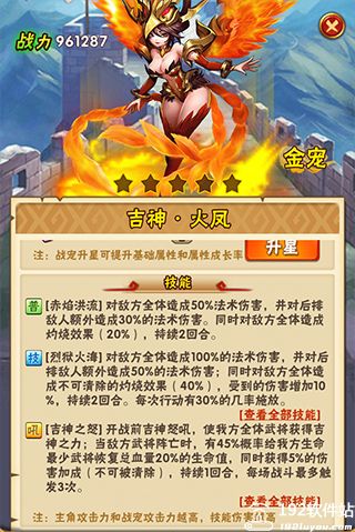 火神·祝融出战属性为全体伤害加成。火神·祝融是攻击宠物,比较适合护佑·主将,更大限度的发挥主将的实力。