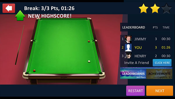 斯诺克全明星中文版,还设计了多个闯关关卡可以进行挑战,不断的提升你的台球技术,学习更多台球的技巧,成为真正的大神。除此之外,玩家还能够观看其他玩家的对战记录,学习了解更多的专业技能,积累经验,变成斯诺克台球之王!有兴趣的朋友来免费下载畅玩吧!