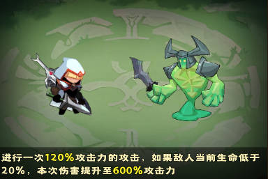 对敌人造成120%攻击力的伤害,若敌人当前生命低于20%,本次攻击的伤害将提升至600%攻击力。