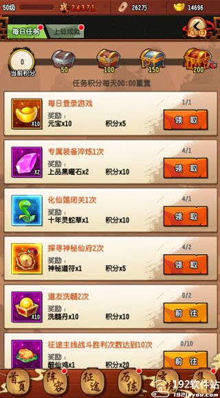 我们在主界面的上方,会看到一个“任务”的按钮,我们的日常任务就在其中哦!只要完成日常任务中对应的任务需求,即可领取丰厚的奖励哦。并且完成日常任务后,会增加我们的任务积分,当任务积分达到50、100、150、200时,将会有额外的奖励!任务积分每天00:00重置!所以小伙伴们要在当天尽量完成至200任务积分