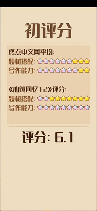 这里说一下,游戏的初始评分是综合写作能力,题材组合来打分的,并且在你能力值和题材等级不变的情况下,就算大量投入灵感,作品最终得分不会超过初始评分+2。比如你开了一本书,初始评分是6,那你大量或积极投入灵感的情况下,后边评分最高能涨到8分,如果你期间提升了能力值,那这个评分可能慢慢超过8分甚至达到10分,这也就是为什么大家觉得游戏前期初始评分哪怕只有7分,最后也能达到10分,但后期初始评分有7分,最后就不会超过9分,就是因为前期能力值能提升,后期提升的比较慢或者能力值满了,作品最高分就=初始评分+2。