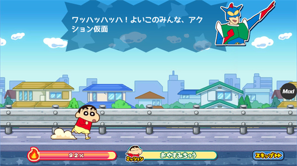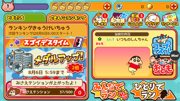 蜡笔小新跑酷是由经典动漫蜡笔小新改编而来的一款角色冒险跑酷手游,而我们熟悉的小新也会登场,玩家可以通过提升角色等级、强化技能、加强属性来让小新拥有更加强大的力量,并且随着关卡难度的提升,后续还有着极其惊险的关卡可以挑战,如果有感兴趣的玩家欢迎来本站下载该游戏试玩,同时游戏已经将日文都翻译成为中文,玩家可以尽情体验。