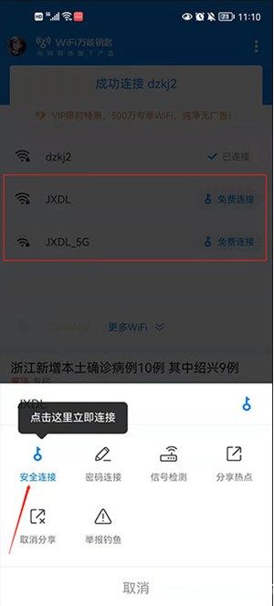 2、通过例图所示,后面带有钥匙的就是可以自动连接的热点,我们只需要点击安全连接就能自动连接WiFi了。