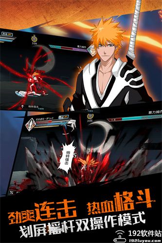 2、再现尸魂界、虚圈、空座町、无形帝国等经典剧情,游戏采用划屏和摇杆双操作模式,移动、防御、连击,尽在点划之间,热血格斗一手掌控。