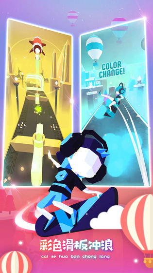 滑板色彩冲浪是一款卡通风格的滑板闯关手游,驾驭滑板在不同的场景中开启一场刺激的闯关冒险体验。