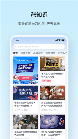 教育app,用户能够通过这款软件来学习平面设计、互联网运营、工业设计、后台开发多种学习教程,帮助用户快速入门,同时还有着丰厚的视频教程,让用户可以对没懂的知识点进行巩固复习,如果有有需要的话就快来下载使用吧。