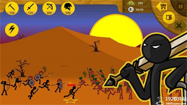 如果点击中间的盾牌按钮,火柴人士兵就会挡在基地前方,就算敌人过来了,也不会退缩一步,而是勇敢的上去与敌人厮杀。