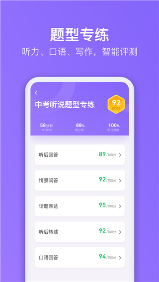 1、软件为用户提供了不同的题型练习,还有各种听力,口语,写作等智能测评。