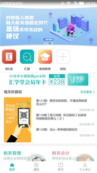 汇学堂是中国税务网全力开发设计的一款专门用来学习财税金融知识的手机软件,功能丰富,可以为公司、老师、学生们给予直播间、录像、在线评估、通过自学管理方法、视频语音手记等基本功能,协助学习财税知识。该系统的教学方式十分与众不同。它是以有意思的推动课堂教学为基础,让用户根据定做的方法通过自学,能帮助用户最大程度地提升学习高效率,进行有意思教学过程中的基础知识更新,提升自己。除此之外,还有很多知名老师进到直播现场,教授知识,共享个人经验,也支持网上咨询。在学习环节中,大家可以立即资询,并能直接获得知名老师的回答。