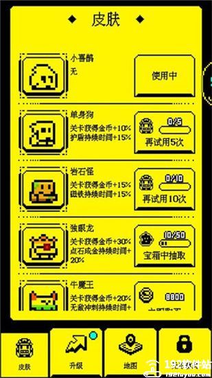 这是一款上手难度不高的休闲闯关类小游戏,有着复古的像素风格,它会提供超多丰富的关卡给大家挑战,让玩家感受到游戏带来的乐趣。这个游戏提供的每个关卡难度各有不同,场景也会不同,越往后的关卡,难度会变得越高,所以玩家的挑战难度加大后,可能会有点不适应,非常考验玩家的灵活力。玩家在关卡里,记得收集游戏里的金豆,完成这些金豆的收集,你就能通过关卡,进入下一关,而且每个关卡都存在威胁,比如陷阱和机关,玩家记得躲避哦!除此之外,本游戏拥有多种不同的角色可以选择,有牛魔王、岩石怪和单身狗等,每个角色拥有的属性各有不同,有的可以增加金币获取数量,有的可以延长道具使用时间,玩家根据自己的喜好选择即可,有兴趣的玩家可以前来参与冒险。