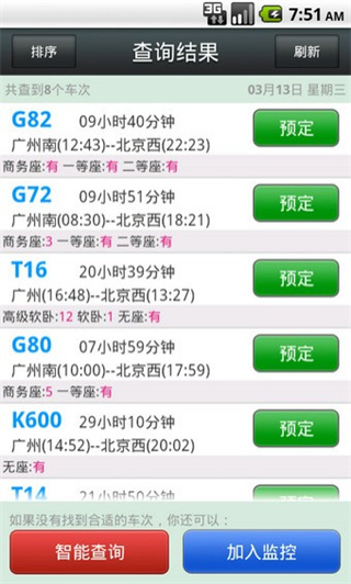 地球人都知道火车票在销售过程中是有车站配额的。比如说一列由北京开往上海的列车,沿途可能经过数十个车站,如果把所有票全部配给北京发售,那么这十几个车站上的旅客恐怕都得站一路了。因此如果碰巧没有买到全程座票,不妨点击这项“智能查询”碰一碰运气,它会按照余票情况,自动将整个路程拆分成多个子段(比如先由北京乘至南京,再由南京坐到上海),反正原则就是每个子段都要保证拥有座位。虽说整个过程麻烦了点儿,而且也要比正常旅途浪费一些时间,但不失为一项曲线救国的好主意。