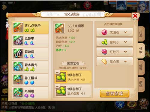 3、镶嵌宝石-30级开启镶嵌宝石能让你的装备更为强大,不同部位的装备可以镶嵌不同类型的宝石。当你的装备达到30级之后,可以给你的装备镶嵌第一颗宝石;当你的装备达到60级的时候,可以镶嵌第二颗宝石;高等级的装备可以镶嵌更高级的宝石。