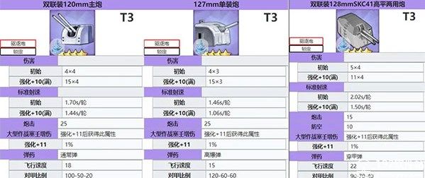 双联120强力通常弹;127单装炮过渡用高爆炮;紫SKC41过渡用***。