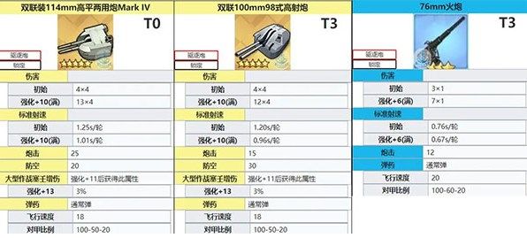 76火炮(右一),通常弹,射速最快的主炮,几乎没有炮击输出,用于主炮占比非常少的驱逐舰。