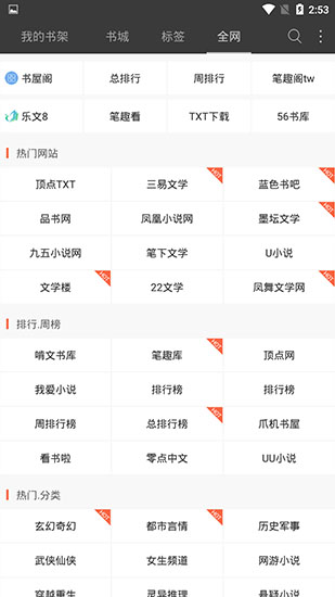 1、在本站下载悦读免费阅读之后进入到首页中去,可以看到有很多小说网站都可以选择进入;