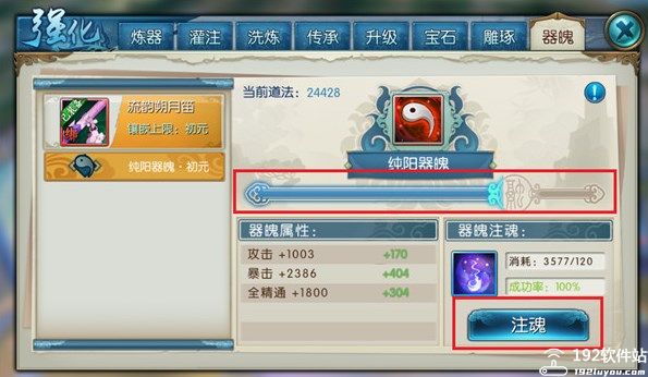 注魂:通过消耗一定数量的【阴阳魂气】增长魂能条并提升器魄属性。