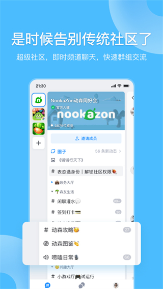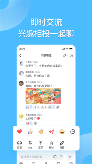 【话题聊天】自定义热门话题,支持通过发送图片、语音、小视频、表情包,与志趣相投的伙伴们实时畅所欲言。