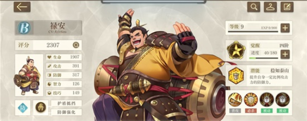 防御系TOP3 初始大将军禄安虽然禄安傻头傻脑是个b级角色,但是一来容易获取碎片迅速突破星级,二来主动技能推三路抗伤害效果还是很好的,三来就是四技能半血以下提升30减伤,持续十秒(没冷却,同时不限制触发次数,还是不错的)