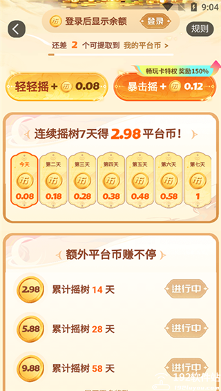 2、每天完成签到可以领取一定的平台币,连续摇树七天得2.98平台币。