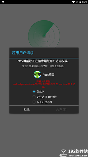 2、进入软件后,软件系统将会自动扫描你的手机是否具备root权限,如果不具备,那么此时我们需要给予该软件访问权限,未给予权限的话,该软件是无法为我们开启root权限的;