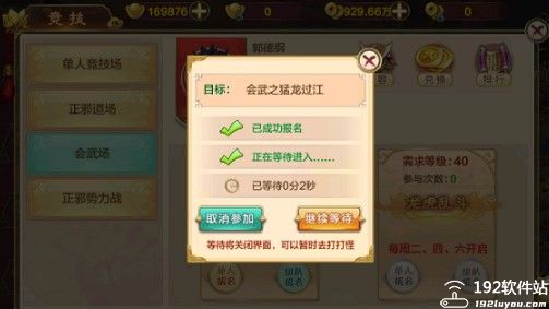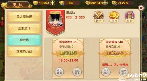 会武玩法是游戏内的一个实时PVP玩法,分为2v2和4v4两种模式。2V2模式【猛龙过江】玩家35级时可以报名参加,每天晚上7点-11点钟开启。4V4模式【龙虎乱斗】玩家40级时可以报名参加,每周二、四、六开启。