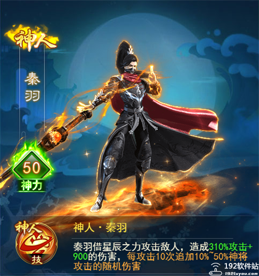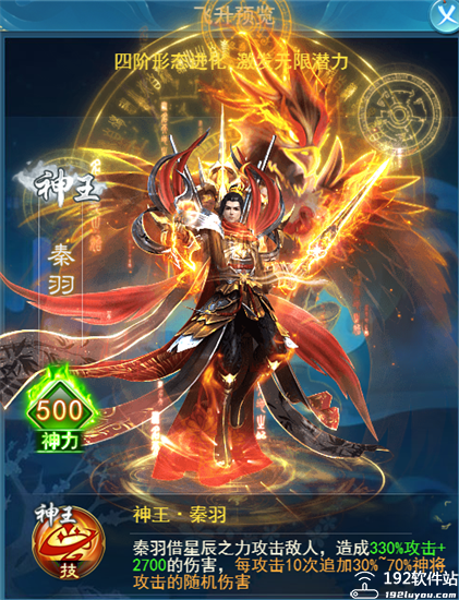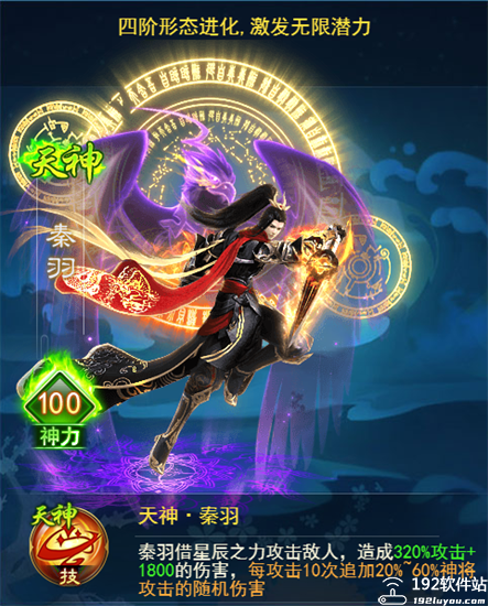 描述:「玄仙·秦羽」可持续进阶,最高可进化至「神王·秦羽」,神力可提升至5500