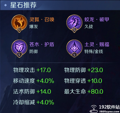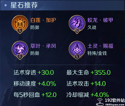 蓝绿星石首选生命值来确保自身的生存能力,冷却速度和移动速度可以提供更高的技能命中率和技能频率。紫色星石推荐蛟龙,草叶,土灵,保证和自身在团战中的持续作战能力的同时,也兼顾了更快的发育速度。