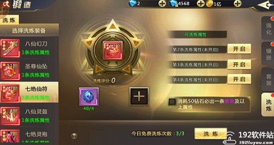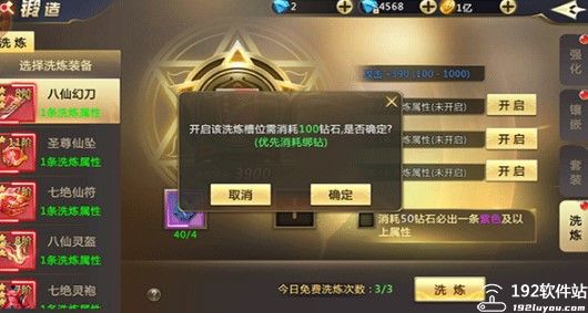 每件装备可以洗练四个格,初始开启一个,以后每开启一个需要花费100钻石,绑定钻石优先,这个建议有条件的玩家在洗练前直接开启四个,因为每天0点会更新免费洗练次数3次,如果不勾选保留的话洗四个格的也是需要四个洗练石,那样大大增加洗出黄色属性,红色极品属性了,洗练以后可以保留在洗其他三个,勾选一个就会多10个洗练石洗练。