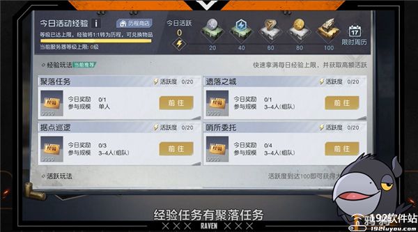 幸存者每天最高可累积100点活跃度,只要搞定了小编前面提到的四个经验任务,就能直接到手80点活跃度。