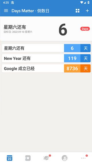 5、正数过去了多少天,倒数还剩下多少天,支持农历日期,重复倒数(每年、每月、每周)。