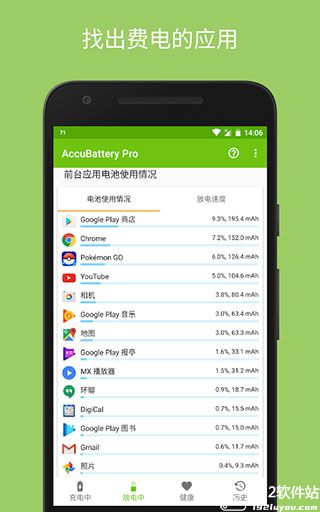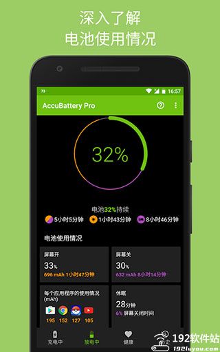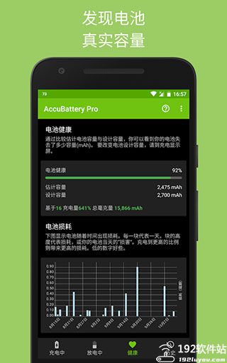 电池健康检测软件,免费提供给大家,破解专业版的全部功能,可以获得更多支持,而且以中文界面呈现给大家,让用户的使用更加简单。该软件的主要作用就是能保护手机的电池,可利用软件提供的功能,对你手机的电池进行监控,例如显示电池的寿命。有了这款软件,用户可以随时检测手机电池的各项情况,提供电池寿命推算、充电到指定额度时提醒、查看手机使用时间和电池使用情况等功能。它的功能对于用户来说,非常实用,能查看电池的损耗情况,看看你的电池能够使用多久。此外软件提供的功能可以统计出手机app的耗电情况,让你看看哪个app占用的资源更大,帮你更好管理电池。