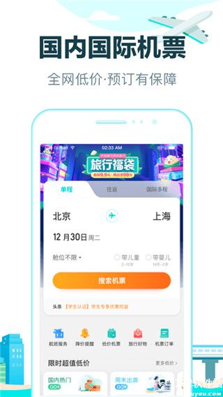 1、机票搜索-可查询12,000条国内、国际航线,找到性价比最高的机票,无需注册即可实现在线付款购票;