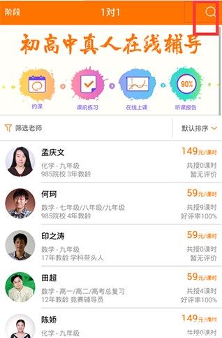 3、可以通过搜索的方式,查找老师,点击右上角的放大镜;