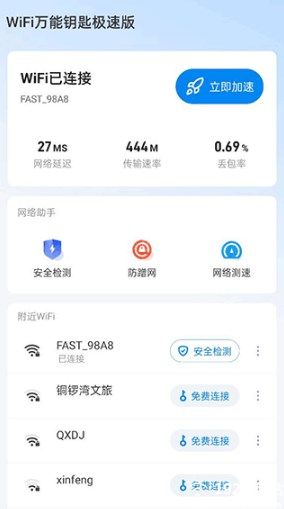 WiFi万能钥匙极速版是一款功能十分强大的WiFi热点工具,拥有简介直观的界面,为用户提供最稳定和最安全的上网服务,帮助各位用户省了超多的流量。该软件的功能非常实用,用户打开软件后,首先需要开启自己的WiFi,等你的WiFi开启以后,就会在软件的列表内,显示附近的WiFi列表,每个热点的强度不同,建议选择最优质的那个热点。通过软件来连接热点,随时都能观看直播和短视频,享受最休闲的生活。可以帮你免费连接优质的WiFi,有了它,你就不用害怕月底的流量不够使用了。除此之外,WiFi万能钥匙软件会对每一个连接的热点,完成安全检测,保证用户连接的网络可以安全使用,让用户用的安心,有需要的用户可以下载哦!