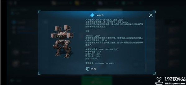 他的技能非常恶心,而且冷却时间较短,具体可以看图,它最大的亮点就是开启技能会得到90%的伤害减免,而且会反弹35%的伤害给链接的那个对手,武器配置方面,说难也不难,说简单也不简单,在中低端局,用四个中加特林(就是攻击距离500那个)升到九级就差不多了,不过他还有一个缺点,那就是血量过少。(适合中高端局)最近要出蝎子,这个东西非常恶心,尤其克制这种等技能的机器人,具体我就不剧透了,因为他还有可能改,以上就是我的推荐了。