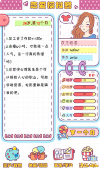 恋爱模拟器手游中文版是一款模拟恋爱题材的全新游戏,其中玩家可以选择自己的角色,并为她输入虚拟的角色名字,有着存款、体力、健康、心情、颜值、情商、智力、人气多种属性,这些都极为关键,数值的高低会角色当前角色的状态,玩家将需要运用这个虚拟的角色展开一段全新的人生,有工作、日常、娱乐、理财、情感多种玩法,在这些不同的领域上我们要竭尽所能的做到最好,并且在恋爱过程中你可以根据你的择偶标准来选择合适的人,通过长期的相处来考虑要不要结婚等一系列的问题。总的来说这款游戏的可玩性很高,并且很多的玩法都十分的自由,能够和游戏的NPC进行真实的交流互动,更有着跌宕起伏的人生经历以及剧情故事,有兴趣的话欢迎来开启一段