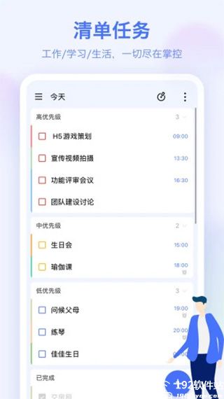 生活实用类软件,把我们的行程事件制作成为图标,到了制定的日期软件就会提醒用户,还可以制作便签、笔记等,将工作和生活中的事情都记录其中。而且软件的界面十分的简洁一眼望去就能详细的了解每个菜单的功能,所以无论是用于记录生活还是工作辅助都相当实用。使用步骤也很简单,只需要创建一个新的任务进行备注标记将它分类到对于的列表即可,到下一次使用时可以在最佳使用列表中快速查找。这款软件可以同步多个设备平台,随时随地的查看之前安排好的计划和事项,还能够添加重点提醒功能以防用户忘记,提供贴心的服务。将诸多事宜都智能分配的井然有序,有需要的朋友欢迎下载软件使用。