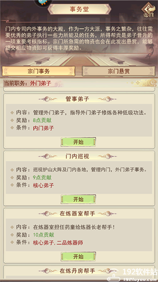 门派事务堂中可执行门派事务获得贡献,门派职务越高可执行的事务获得的门派贡献越多。门派每百年会发布宗门悬赏完成悬赏也可获得门派贡献。