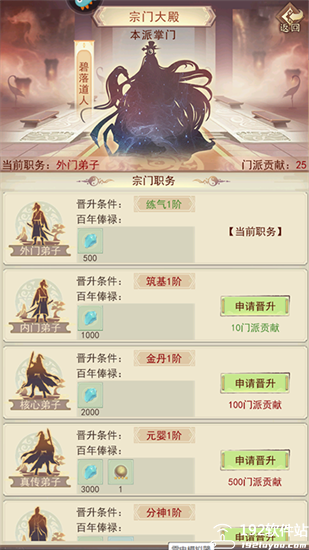 境界达到要求后,可在宗门大殿中消耗贡献提升自身的门派职务。门派职务越高,每百年领取俸禄越多,门派中的许多位置都需要一定的门派职务方可进入。