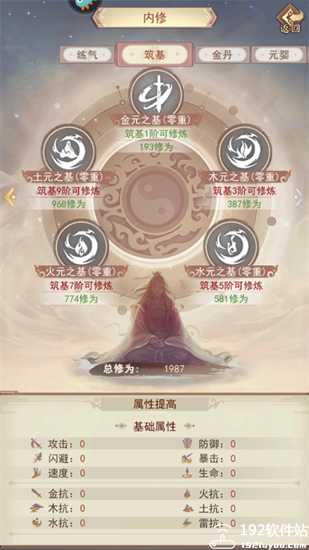 除此之外,内修,炼体,丹药,法宝,以及修真途中的各种机缘均可提升自身属性。各项属性中,以防御和攻击属性最为重要,所以应该优先学习门派中的心法,其次是攻诀。
