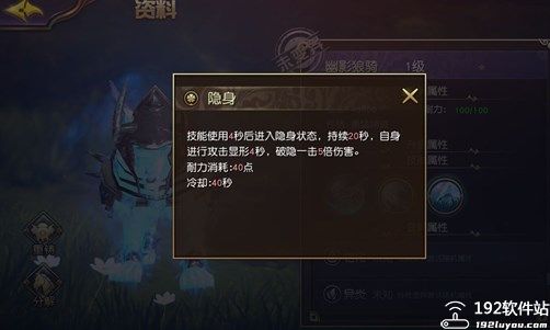 幽影狼骑技能:隐身(图3)在使用技能四秒后能进入隐身状态,持续20秒,自身进行攻击显醒4秒,破隐一击五倍伤害。
