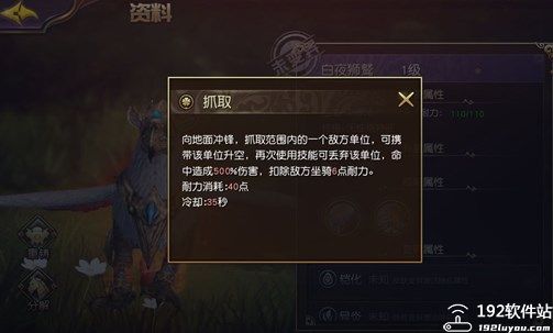 白夜狮鹫技能:抓取(图2)向地面冲锋抓取抓取选取范围内敌方单位,可携带该单位升空,再次使用技能可丢弃该单位,命中照成500%伤害。