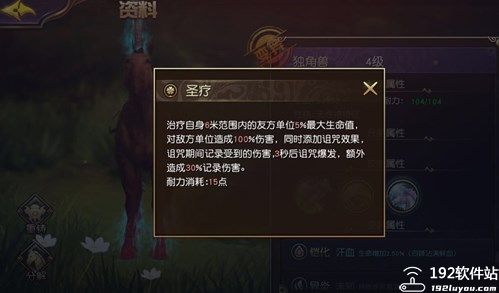 独角兽技能:圣疗(图1)能够为6米范围内治疗5%的生命值还能照成100%的伤害同时添加诅咒效果。