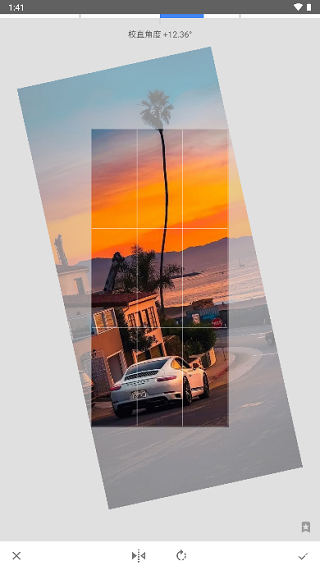 5、旋转:能够旋转照片,和水平翻转照片。有些照片普通视角下看起来比较一般,通过旋转处理之后,视觉冲击感立刻变得不同。在【旋转】工具的底部菜单中,仅有两项调整功能,一是水平翻转照片,二是让照片旋转90度的按钮。